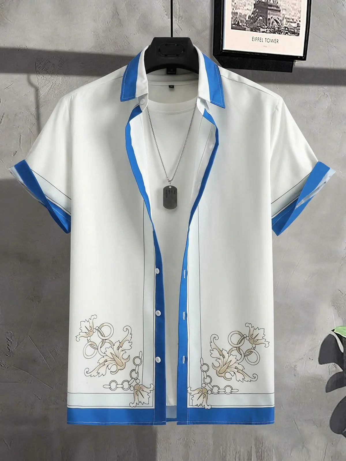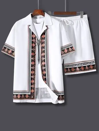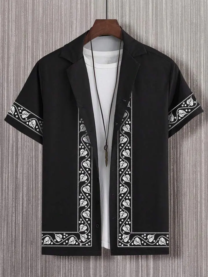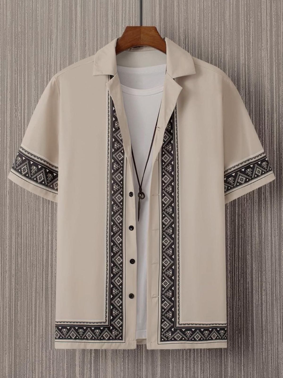 This stylish beige short sleeve button-up shirt features intricate black and white geometric trim along the front, sleeves, and hem, giving it a modern, cultural-inspired look. Lightweight and comfortable, it’s perfect for casual outings, summer layering, or streetwear styling. Pair it with jeans, shorts, or chinos for a trendy, effortless outfit.